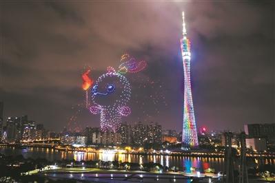 4月22日晚上,广州举行十五运会开幕倒计时200天无人机表演,天地辉映的“两座”广州塔、可爱的吉祥物、“全运coming 广州购ing”礼盒等图案引来市民阵阵欢呼。图/广州日报全媒体记者苏俊杰