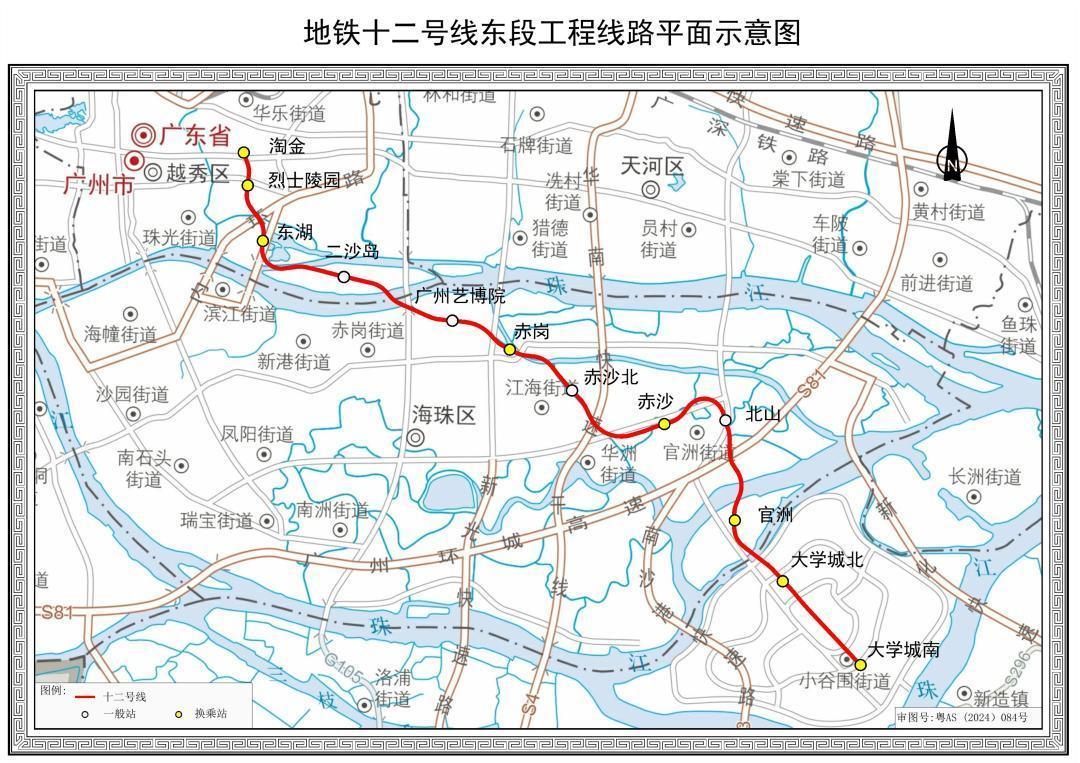 十二号线站名分两次公开征求意见,本次获批的是去年征求民意的首批站名,自东往西依次为:大学城南、大学城北、官洲、北山、赤沙、赤沙北、赤岗、赤岗塔、二沙岛、东湖、烈士陵园、建设六马路。