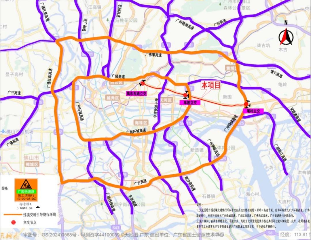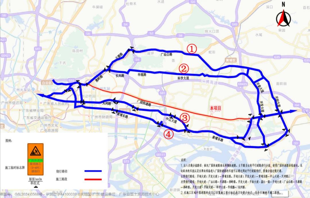 广园快速路(禺东西路至笔村立交路段)现状为双向八车道,将逐段封闭双向各1—2个车道进行占道施工,具体占道区域将根据实际施工需要确定。作业时间为每天0:00~6:00。请过往车辆在施工期间,根据交通管制措施和现场交通指示标志,合理规划出行路线,建议依托南北两侧高速公路、周边主要平行城市道路进行绕行。