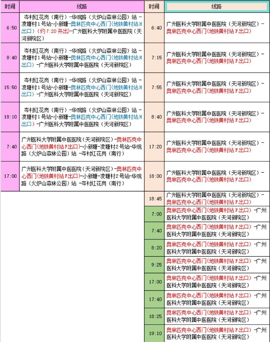 结合市民反馈的意见和需求,线路设计分别从岑村红花岗和黄村地铁站两地前往广州医科大学附属中医医院(天河新院区),下面是两条线路的具体发班时间。
