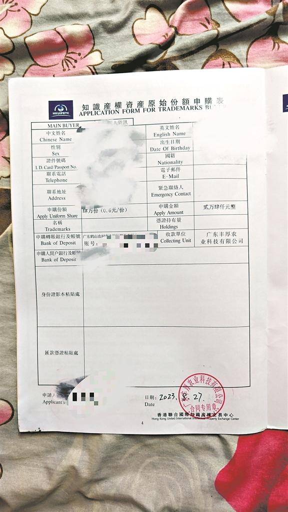 梁涛介绍,他母亲先后参与了两家公司的“投资”项目,一家名为“广东恰好教育投资股份有限公司”,另一家则叫“广东丰厚农业科技有限公司”。他出示了其中一家公司给他母亲提供的“知识产权资产原始份额申购表”,上面显示购入的金额为“贰万肆仟元”。“凡是涉及钱的项目,他们都会给我妈发语音、打电话或是面谈。”梁涛说,“迄今我母亲已经为此投入累计162000元,但每一笔费用都是不同的个人账户收的钱。”梁涛说,他已经将相关证据提供给警方。