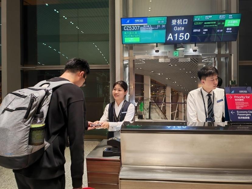 为保障旅客顺利出行,南航在广州白云国际机场二号航站楼开设4个专属值机柜台,方便旅客识别并高效办理值机、托运手续,做好旅客在始发站通关引导及经停站的服务指引,高效保障首航航班110名旅客顺畅出行。