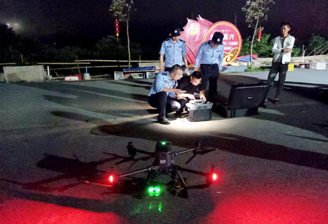 夜间林区能见度低、地形复杂。在明确救援方案后,无人机分队再次分成2个梯队开展技术支援:第一梯队利用便携式无人机初步锁定受困经纬度;第二梯队由大型无人机搭载红外夜视、高亮度照明、大功率喊话设备,通过热成像扫描与灯光投射,实时回传山林实况影像,为地面救援组导航破障。