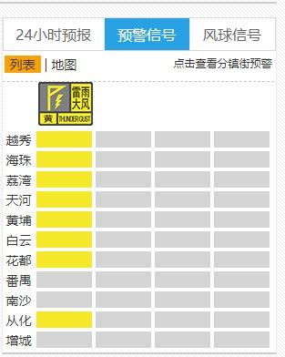 5月5日14时50分,除上述两区外,广州市海珠区、白云区、荔湾区、黄埔区、花都区、从化区雷雨大风黄色预警信号也在生效中。
