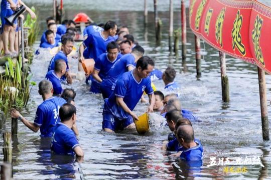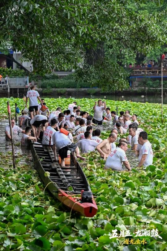 将埋藏在湖底的龙船起出并非易事。村民梁绵海回忆:“从我10岁起,每年四月就跟阿爸下水挖龙船。沙泥裹着船身,就像巨龙在冬眠,我们要亲手把它‘叫醒’。”吉时一到,数十名泮塘青壮年纷纷赤脚下水,走进湖床,大家先清理积压在船舱里的沙泥,再慢慢刮松船底的泥浆,随后众人齐心协力,将龙船从水中缓缓抬起。接着,用桶盆等工具往外舀水、清除淤泥,龙船才渐渐浮出水面。清洗后的龙船以猪油涂抹、彩旗装点,方显“神龙”威武。