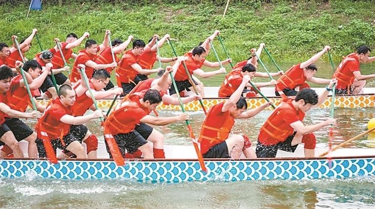 首届“新溪杯”龙舟赛上,四支龙舟队水上竞渡,场面十分热闹。