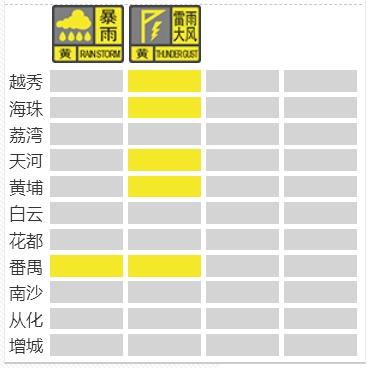 越秀区、天河区雨大风黄色预警信号生效
