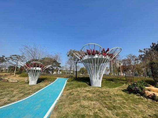 其中一期项目——金红主题区已在春节前建成并对外开放。这里汇聚最具花都特色的“花植物”,共种植70余种特色花卉,形成四季有花、季相分明、繁花盛开的景观效果,公园内设置健身步道、儿童游乐区以及多处休憩凉亭,满足不同年龄段市民的需求,通过景观提升、设施完善和功能分区,将原本单一的交通绿带转变为集休闲、运动、文化于一体的开放式公园,其独特的设计理念和实用的功能布局赢得广泛好评。