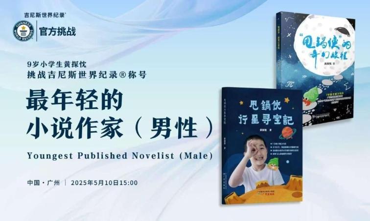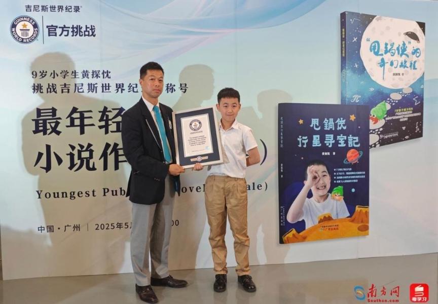 5月11日,吉尼斯世界纪录认证官在广州海珠区石磨坊工作室,见证9岁少年黄探忱成功挑战“世界最年轻男性小说作家 Youngest Published Novelist (Male)”称号。