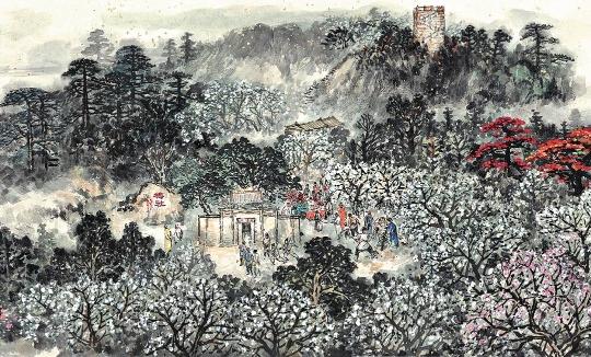 梅社书画院院长张森霖的《漱珠春晓》描绘了纯阳观繁花似锦的春景。(受访者提供)