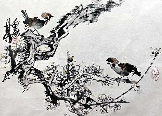 梅社名誉社长林墉的画作《鸟语花香》(受访者提供)