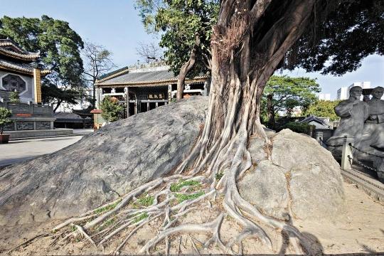 从中山大学南门走到斜对面,穿过熙熙攘攘、车水马龙的中大布匹市场,一片古韵悠然的青灰色石砌建筑群掩映于古木奇石之间,这里便是纯阳观。