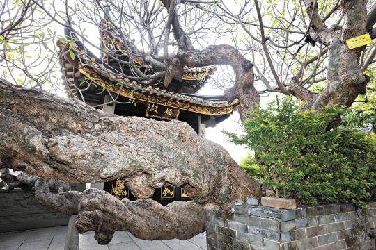 广州人称“北有三元宫,南有纯阳观”。纯阳观依山而建,坐北朝南,从岗下沿东南角拾级而上,嘈杂声瞬间屏蔽,仿佛进入另一片清静天地。沿着中轴线前行,首先映入眼帘的是山门,它是道光四年建观时留下的珍贵遗迹,门头的横额和对联“灵山松径古,道岸石门高”,出自清末广州十三行首富潘仕成之手,笔锋刚劲有力。穿过灵官殿,可见岭南现存最大的《道德经》碑刻,由当代书法家梁鼎光以楷书挥就,笔力遒劲。