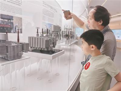 在南方电网科技交流中心,家长正给小朋友讲解展品。广州日报全媒体记者骆昌威 摄