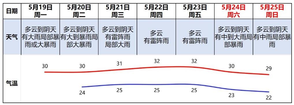 5月19日,市防汛防旱防风总指挥部办公室与市气象局、省水文局广州水文分局对我市的气象水文情况进行了会商。会商指出,预计,19日至20日,受中层波动和低层南风影响,有大雨到暴雨,局部暴雨或大暴雨,并伴有短时强降水(最大小时雨强50~80毫米)、雷电和局部6~8级短时大风等强对流天气;21日至23日,多云到阴天,有雷阵雨局部大雨;24日至25日,受高空槽、切变线和弱冷空气影响,有中到大雨局部暴雨。