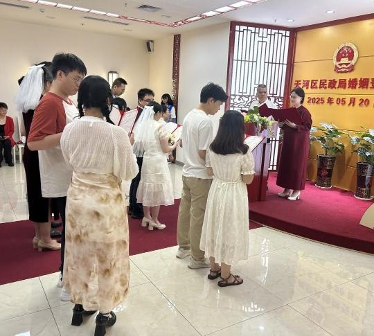 据了解,为满足新人在“5·20”这一特殊日子办理结婚登记的需求,天河区民政局婚姻登记处延长服务时间,增加人力保障,提高服务效能,全力满足高峰日群众的登记需求。
