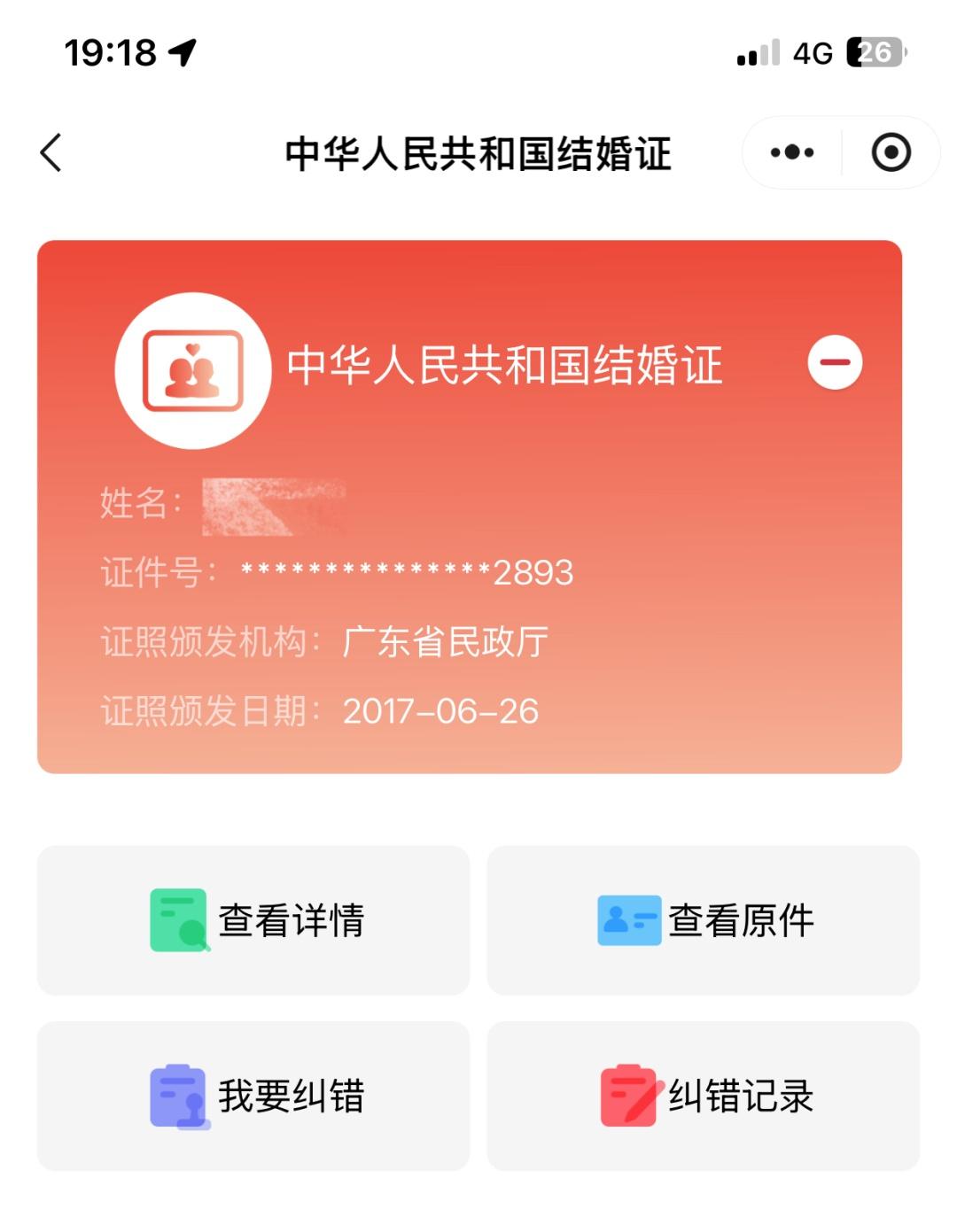 电子结婚证上除了显示个人姓名外,还有证件号、证照颁发机构和日期。