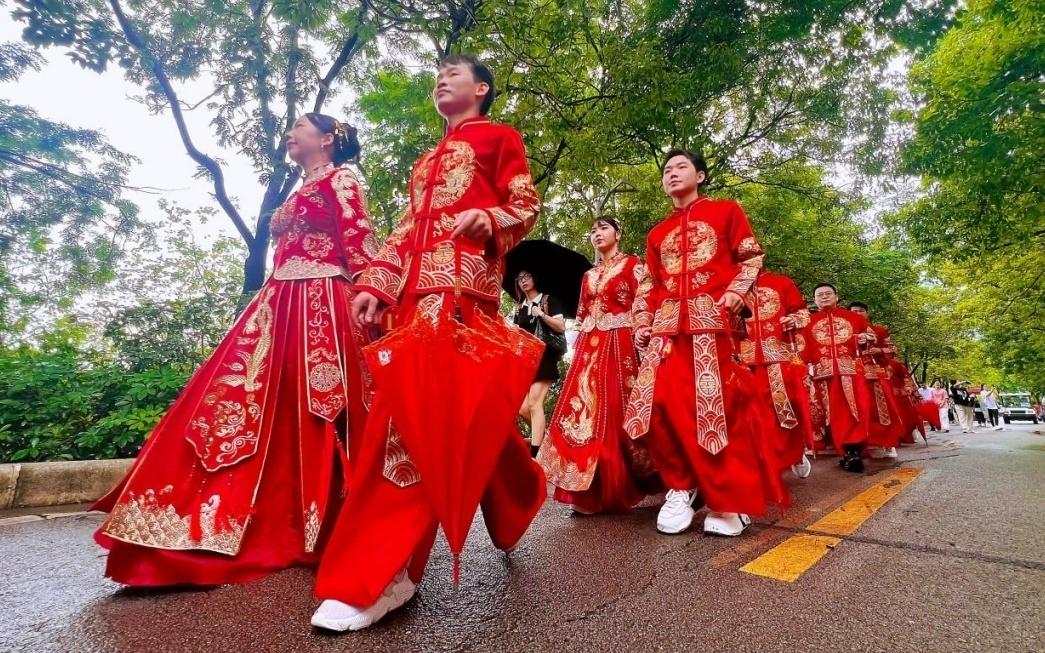 “我们不是复刻传统,而是让文化基因与现代价值观对话。”活动策划方表示。新人巡游路线更暗藏巧思,999米步道串联起5200米爱情跑道(全长5.2公里),将“长长久久”的民俗寓意与“我爱你”的浪漫表达巧妙结合,新人在体验仪式时,既能感受到文化的厚重,又能触摸到时代的脉搏。这种创造性转化、创新性发展,让传统婚俗成为年轻人表达自我的新载体,也是深化婚俗改革、弘扬文明新风的新动力。