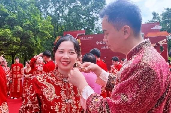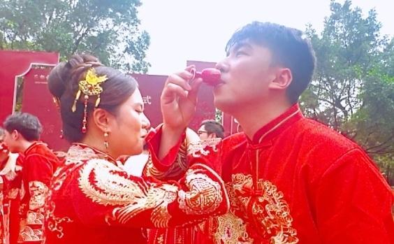 当20对新人在“岭南缘”完成“三拜礼”时,将“结发同囊”“合卺共饮”与现代宣誓结合,保留了传统中式婚礼的古典意趣。20对新人在鲜花、掌声和亲友的祝福声中大婚礼成,许下相伴一生的美好诺言。