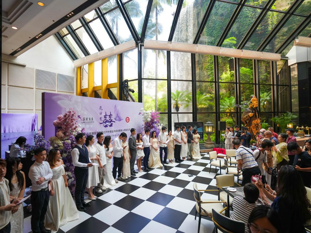 广州花园酒店副总经理梁健芬介绍,广州花园酒店是首批豪华五星级酒店标志之一,坐拥2.1万平方米的城央岭南风情园林后花园,颁证点位于酒店后花园,周边果木飘香、花影摇曳,18米高瀑布奔流倾泻激起层层水雾,清澈水域中上百条锦鲤悠然畅游,为新人誓言增添“富贵吉祥、连年有余”的美好寓意。园中廊桥曲径、一步一景,与周边高楼车流交织的现代都市景致形成动静相宜的对话,“轻、巧、通、透”的岭南建筑与浪漫中式美学在此交汇,尽展历史、艺术与文化的璀璨光彩。通过“婚姻服务+文旅”的跨界融合,在满足新人多元化、个性化、品质化的婚恋服务需求的同时,也进一步激活年轻群体的消费意愿和消费潜力,辐射带动周边文商旅产业发展,从食住行游娱购等多个方面激发“甜蜜经济”新活力。