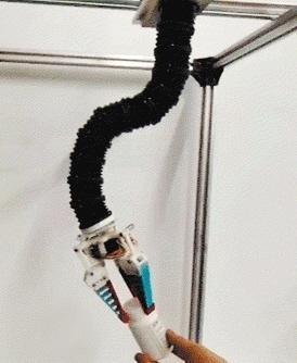 记者看到,钟勇团队设计的象鼻机械臂内部由一组电机和柔性可伸缩的弹簧组成,这一节节弹簧可以伸缩和旋转,变出各种姿态,在象鼻的最前方还安装了一支仿生软体抓手。“象鼻机械臂在狭小空间中的灵活性非常高,比如可用于发动机等狭小空间的探测与维修,象鼻机械臂可以直接伸进去,寻找并解决‘病灶’。”