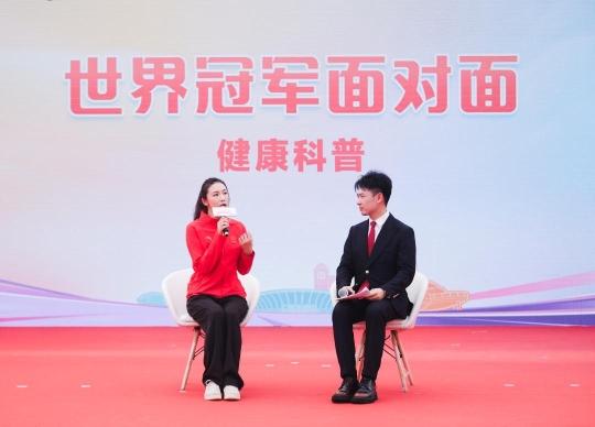 陈晓君鼓励大家积极进行体重管理,还带领全场跳起减脂操。现场气氛热烈,居民群众一睹“水上蝴蝶”风采的同时,跟着冠军尽情燃烧卡路里。