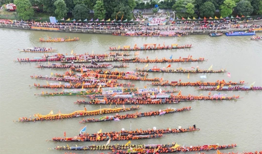 6月1日,2025年荔湾区龙舟邀请赛暨龙溪沙溪第60届龙舟景将在下午1点的花地河沙溪河面正式打响!今年参加龙溪沙溪龙舟景的参赛队伍为29支,其中传统龙队伍为14支,标准龙队伍为15支,队伍有来自广州荔湾区的海北西浦、东石、南村、增滘大和、步漖、龙溪凤池、蟠龙、南边、海中村等,以及来自佛山的厦漖永胜、聚龙、宝华、罗城、谢边村等。按照赛制规定,赛程将按照“传统龙初赛—标准龙初赛—标准龙决赛—传统龙决赛”的流程进行,统一以秒表计算时间作为各船的成绩,其中传统龙竞渡项目采用直道折返的形式,全程约1000米,标准龙竞渡项目采用单程计算,全程约500米。