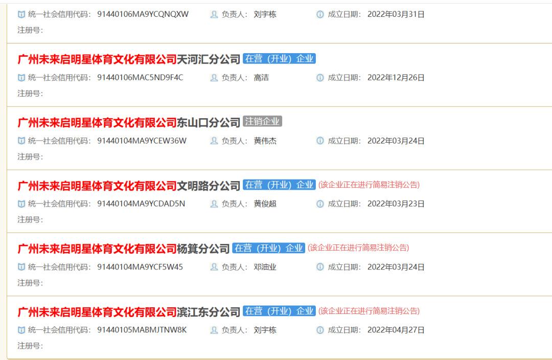 同时,5月23日国家企业信用信息公示系统显示,广州未来启明星体育文化有限公司旗下几乎所有校区分公司都在进行简易注销公告,部分校区分公司更是已显示为“注销企业”。目前不少家长已经以各种方式向有关部门提出注销异议。