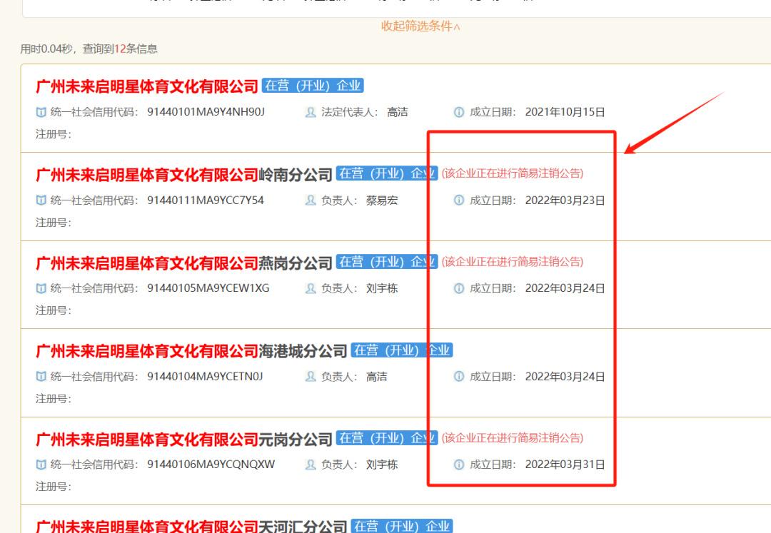 同时,尽管广州总部的法定代表人一再对家长表示“想办法复课”,但国家企业信用信息公示系统显示,广州未来启明星体育文化有限公司旗下几乎所有校区分公司都在进行简易注销公告,部分校区分公司已显示为“注销企业”。广州未来启明星体育文化有限公司更是在5月21日已提起变更法定代表人,不过该项变更于5月23日被天河区行政审批部门和市场监管部门限制,目前该公司已被监管部门列入“信用异常状态”。