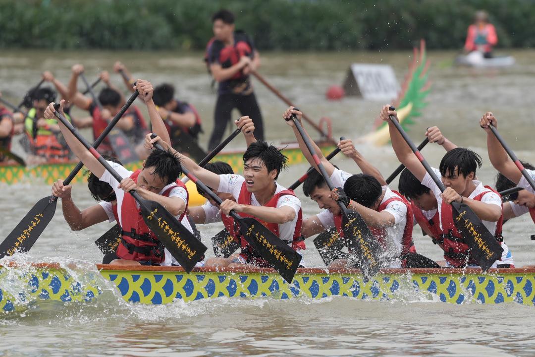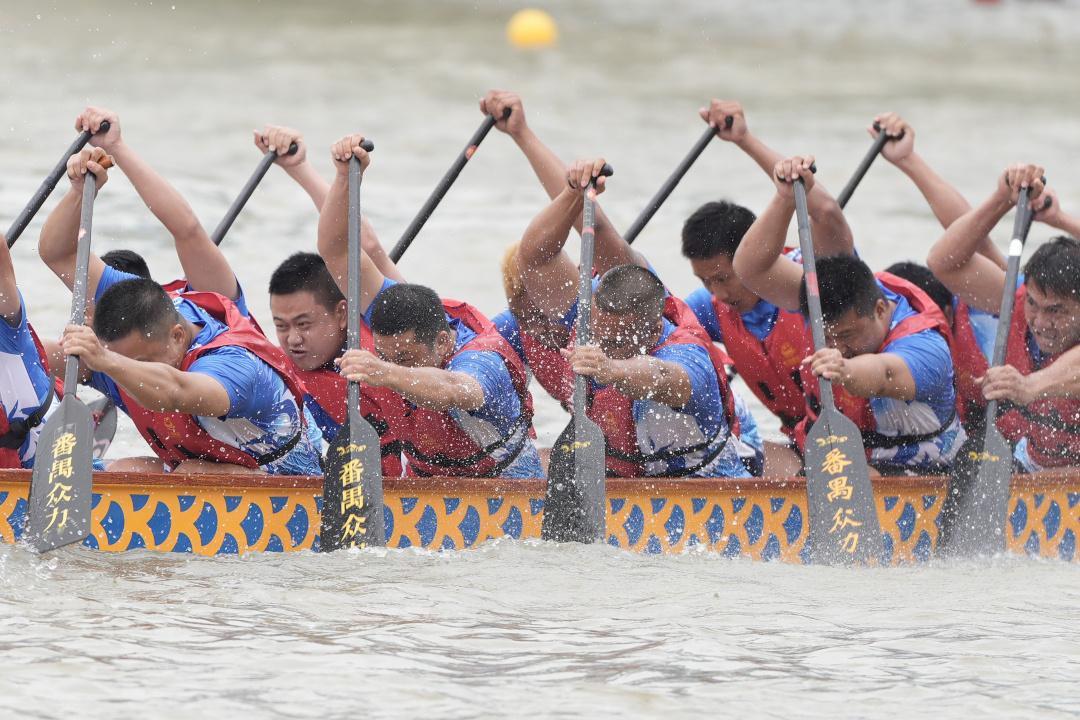 号角吹响、鼓声擂动,飞桨劈浪间水花四溅,整齐划一的呐喊响彻云霄!