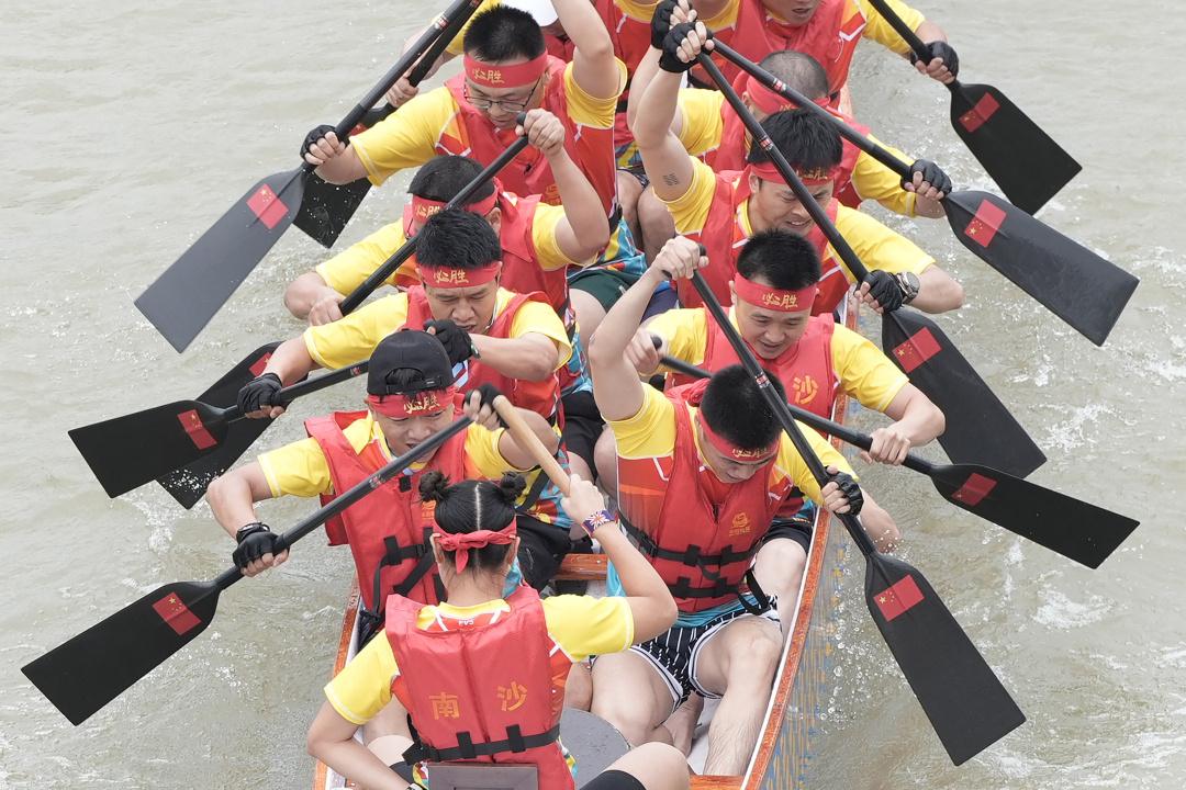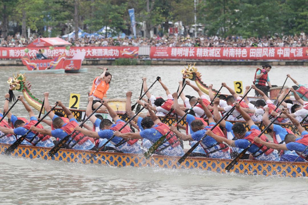 现场一片沸腾,岸上助威声与水上鼓点交织,炎热的天气也无法阻挡南沙人“龙舟DNA”的觉醒。