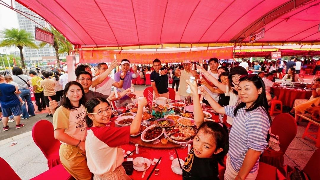 在品尝美味佳肴的同时,现场还有岭南特色节目助兴。当威风凛凛的南沙醒狮踏着铿锵鼓点腾跃翻飞,原生态咸水歌谣裹挟着海风咸香在耳畔回荡,新创南沙主题歌曲用激昂旋律奏响时代强音——这不仅是舌尖上的盛宴,更是南沙文化传承的美好展现。当美食遇见民俗风情,当龙舟健儿以桨为笔书写同袍情谊,这场跨界交融的文旅嘉年华,正以美食为媒、文化为魂,在觥筹交错间架起粤港澳大湾区文化共鸣的金色桥梁。