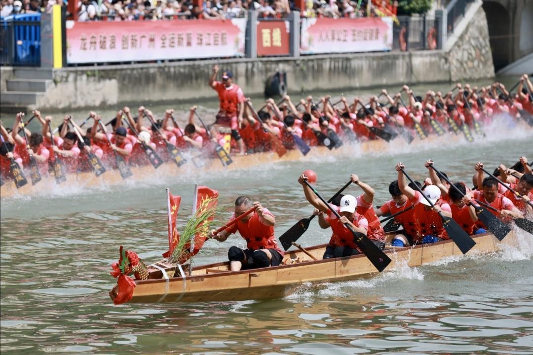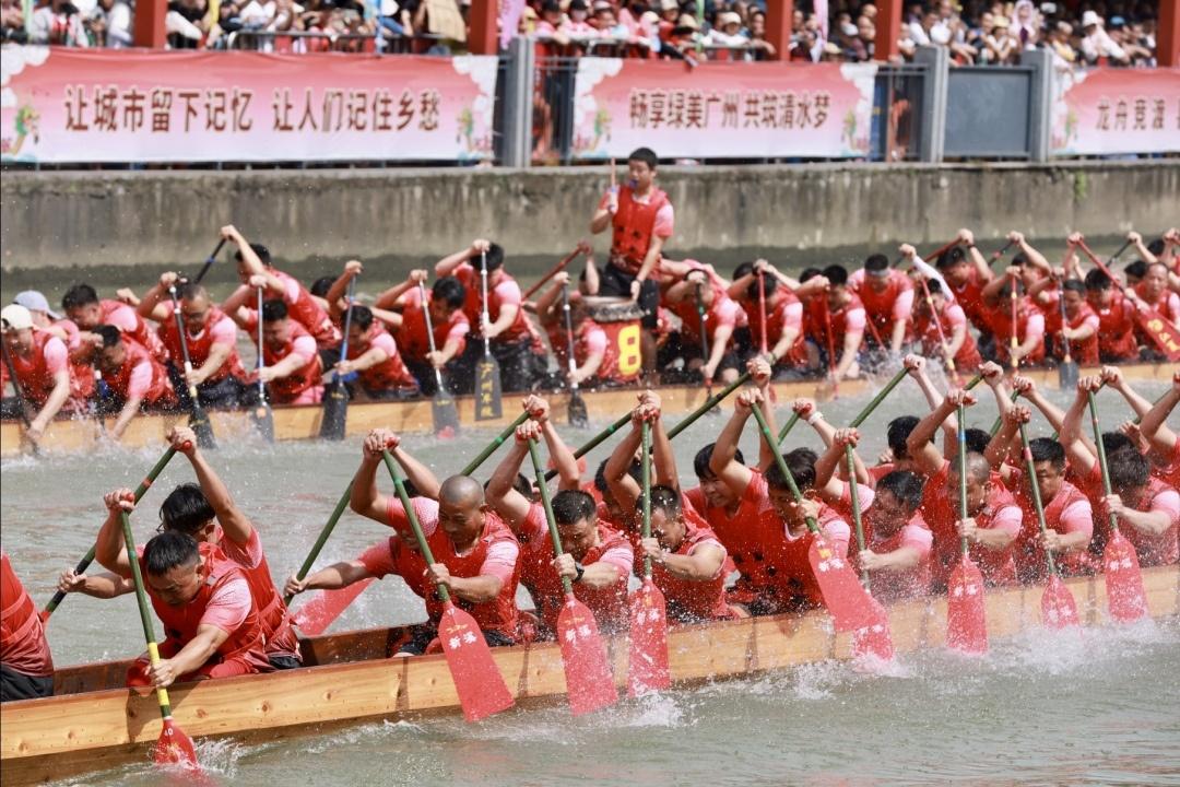 今天,车陂村内12支龙船队展开激烈角逐,最有看点的是“回龙”环节,也是整个车陂龙舟比赛中最考验技巧的环节。龙船从起点到达赛道另一端后,桡手们要转身折返。