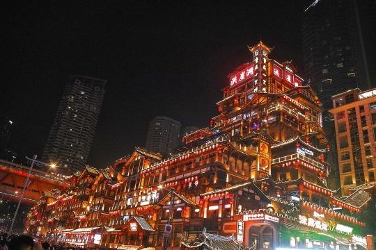 重庆两江游共有8艘游轮运行,朝天门码头是两江游的起点。码头前矗立着重庆市地标建筑、高约355米的来福士商业广场,该建筑由8栋超高层塔楼、6层商业裙房构成。正值枯水期,来福士一层至长江江面有约50米的落差,在夜色笼罩下更显巍峨雄壮。如果来福士代表现代的重庆,洪崖洞则是山城的另一张名片。亮灯时分,从船上遥望依山而建的吊脚楼群,宛如置身《千与千寻》里的奇幻世界。1982年开通的长江索道,曾是重庆市民过江的“空中走廊”,如今成为游客欣赏重庆夜景的“移动观景台”,从游轮上仰望索道上的缆车,更让人亲身感受到这座“8D山城”的魔幻。沿岸的重庆大剧院建筑造型独特,与周围的江景、山景相互辉映。沿江而行,湖广会馆、南滨路、慈云寺、千厮门大桥、重庆科技馆等古今建筑,同样吸引了众多目光。