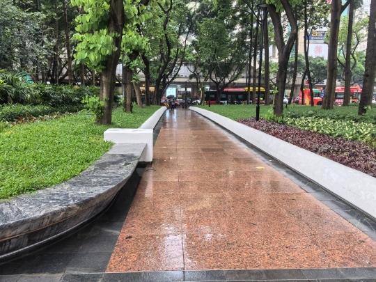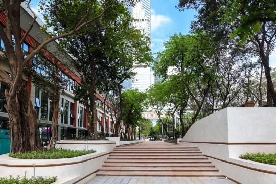 运用生态处理手法,区域内道路的行道树为根系发达、浅根系的榕树为主,本次改造扩大原有较小的树池,部分做成连续树池,让树木有更好的生长空间,提升安全保障。针对地铁通风、地下广场排烟等大型设施,结合场地生态景观一体化设计,采用简约的立体绿化格栅做遮挡,疏密有序,既发挥降噪作用,又有效降低周边温度。因地制宜优化绿色空间。在不破坏、不迁移乔木的前提下,修剪美化现状乔木,选用细叶榄仁、鸡蛋花、翠芦莉、粉黛万年青等长效、易维护的耐阴或耐半阴植物,降低维护成本;因地制宜补植小叶榄仁10株,延续街区绿化生态景观、增强序列感。