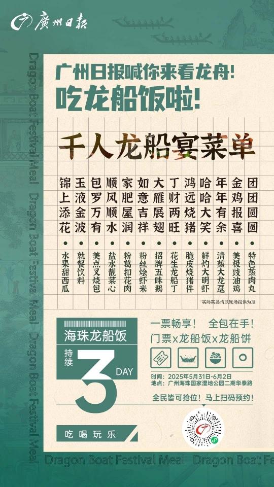 宴席间,龙舟鼓点与欢声笑语相融,孩童手执彩粽追逐嬉戏,岸边彩旗与湿地绿意相映成趣。市民伍先生笑言,“龙船饭吃得热闹,日子才能红火!”大家边品味地道广府菜,边用手机记录下“赏龙舟竞渡,品龙船佳肴”的鲜活民俗。