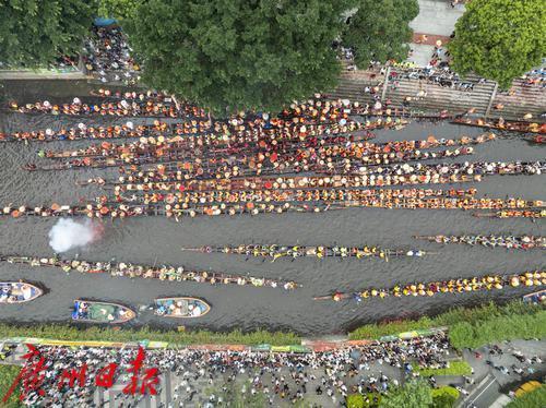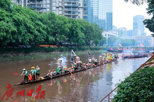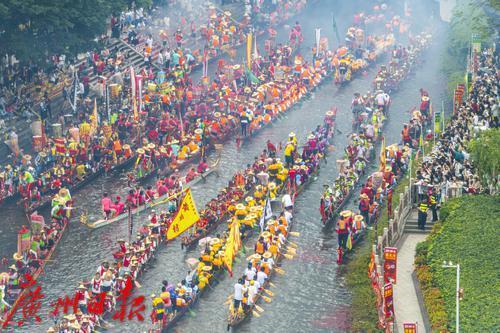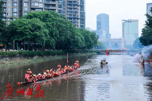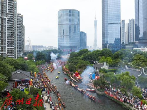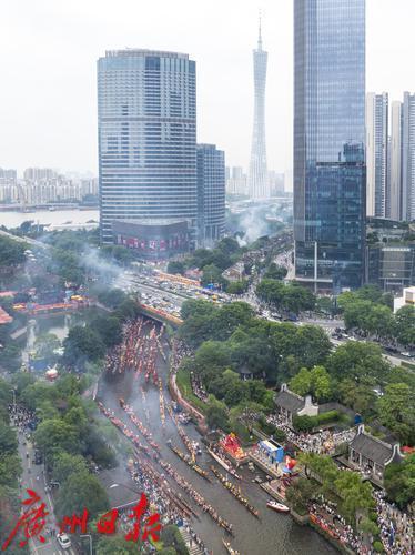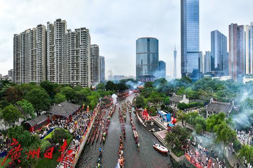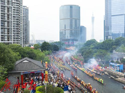 5月31日(农历五月初五)上午,端午节当天,锣鼓喧天、鞭炮齐鸣,一场热闹的龙船招景正在猎德涌上演,多艘龙船从四面八方的村子赶来“探亲”。河涌两岸,挤满了围观的市民游客,欢呼声此起彼伏,十分有节日气氛。