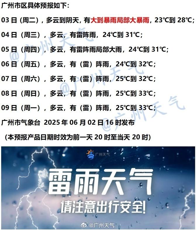 ● 2日,粤北和珠三角中北部市县有大雨到暴雨局部大暴雨,雷雨时伴有8级左右的雷暴大风,其余市县有雷阵雨局部大雨或暴雨。最高气温:韶关北部、清远北部市县30~32℃,其余市县33~35℃。