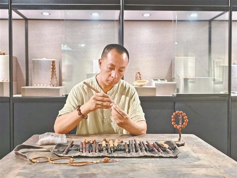 彭德平艺术工作室的匠人正在雕刻榄雕作品。