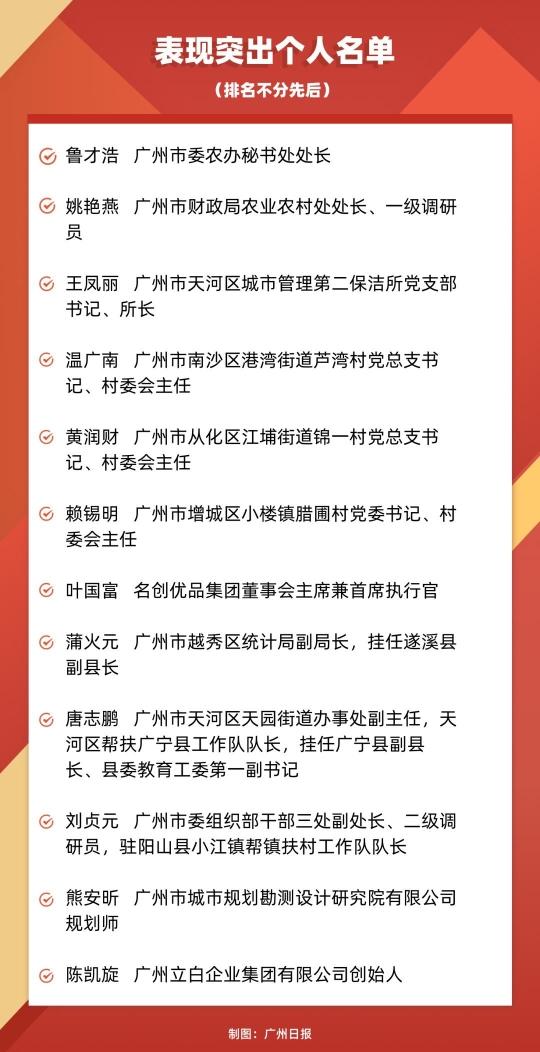 近日,广东省委、省政府办公厅发布《关于对推进“百县千镇万村高质量发展工程”工作表现突出集体和个人给予表扬的通报》,对200个集体和200位个人给予通报表扬。其中,广州12位个人上榜表现突出个人名单。