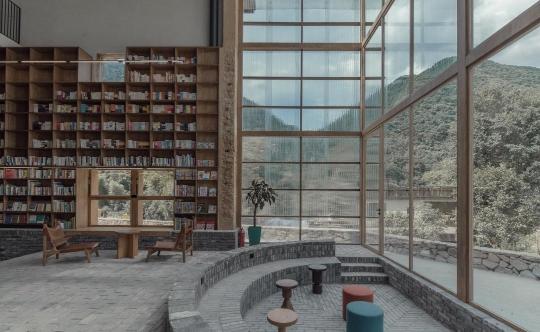 从外望去,放语空主体建筑的外墙是土黄色的,大面积的玻璃结构将自然光影引入建筑内部。室内,高大的木质书架林立,书架间的空隙处,偶尔能瞥见窗外的青山。