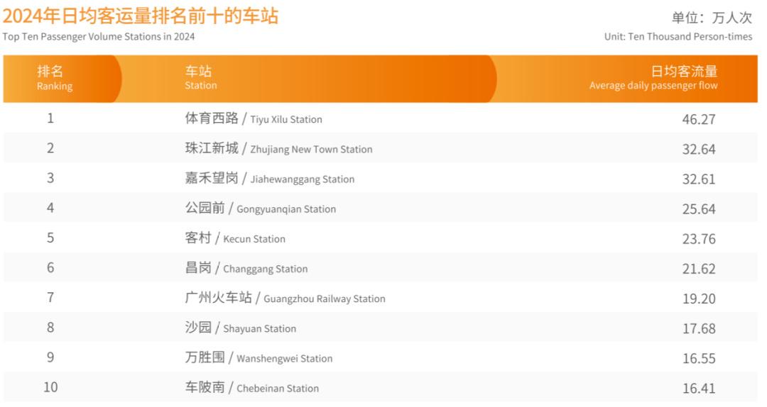 报告公布了去年各线路的日均客运量,三条线路客流量突破百万大关:三号线(含北延段)、二号线、五号线。客运量增幅最大的是七号线,日均客流同比上升39.47%,达40.35万人次,主要原因在于该线路前年开通了二期工程。同时,客运量前十的车站出炉。体育西路、珠江新城、嘉禾望岗稳居三甲,与前一年相比,珠江新城和嘉禾望岗的差距进一步缩小。