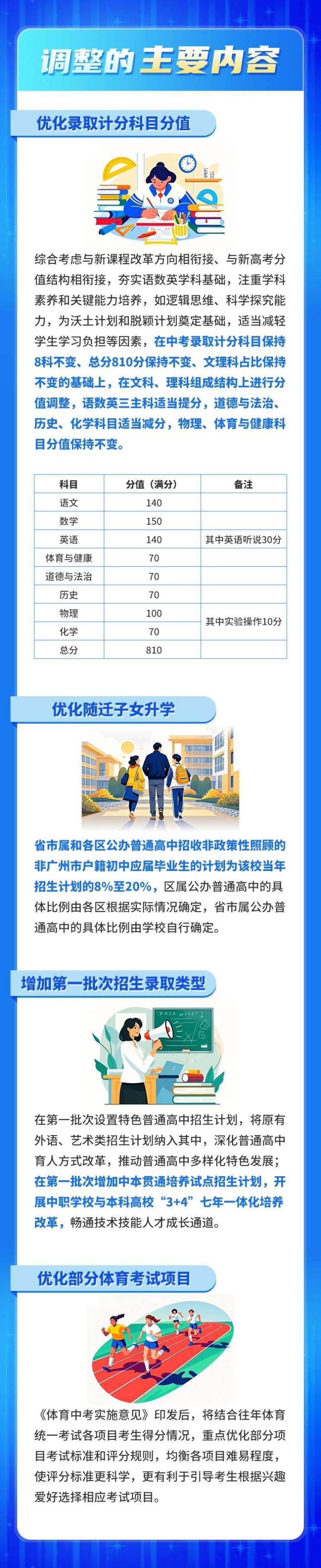 据悉,调整的主要内容包括优化录取计分科目分值、优化随迁子女升学、增加第一批次招生录取类型、优化部分体育考试项目。其中,数学分值从120分升至150分,语文、英语分别从120分升至140分,道德与法治、历史分值从90分降低为70分;化学分值从100分降低为70分。中考满分为810分,保持不变。中考第一批次增加中本贯通培养试点招生计划。