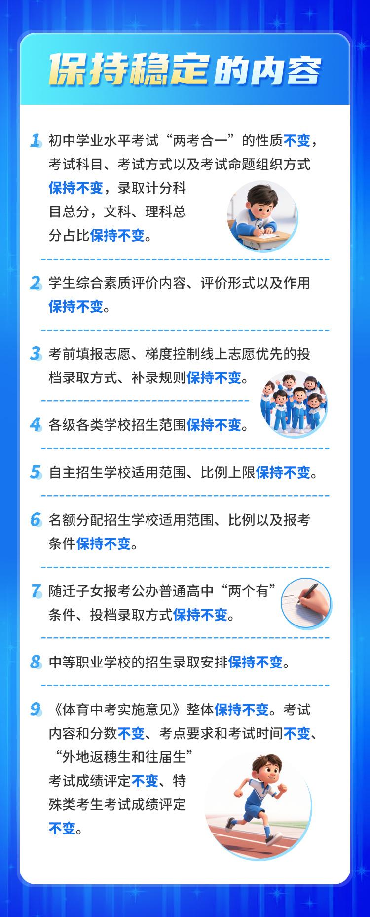 中考改革是一项系统工程,录取计分科目、录取参考科目、实验操作考试等相关配套文件预计年内出台,名额分配、自主招生、特长生、填报志愿等相关文件按年度时间节点发布,形成“1+N”综合政策体系。
