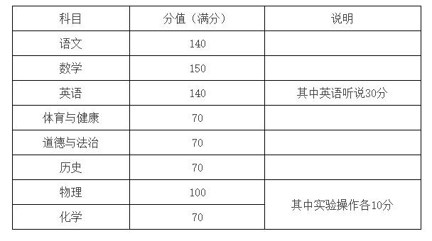 录取计分科目为语文、数学、英语、体育与健康、道德与法治、历史、物理、化学,满分为810分。具体见下表:
