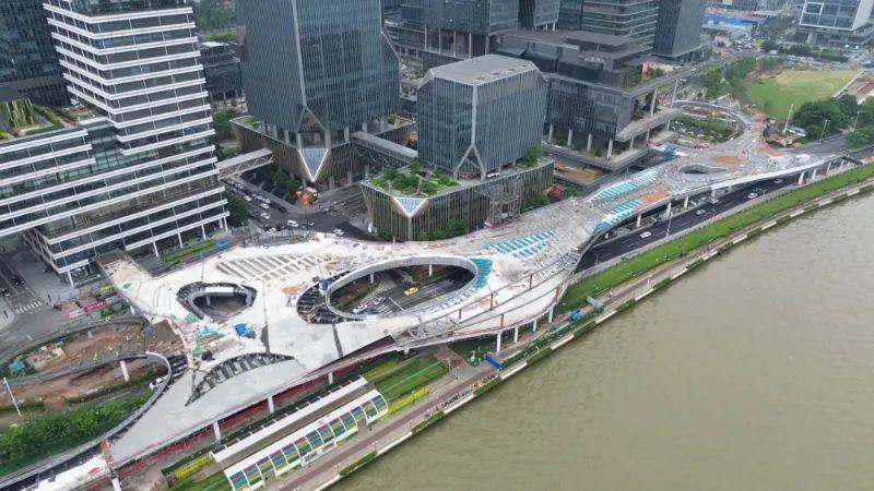 记者从项目施工方中建科工广东公司了解到,项目以“碧水云桥”为理念,契合云山珠水的城市格局,采用曲线线条为主要设计元素,塑造云涛起伏、碧波荡漾的形象意蕴,突出轻盈、灵动的效果,与珠江互相映衬。独特的地理位置赋予了立体平台多重功能: