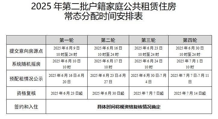 2.系统随机摇房。公租房常态分配系统根据每轮申请家庭在公租房常态分配系统完成申请时间(即成功提交意向房源点时间)的先后顺序,按照本通告规定的分配原则于2025年6月5日至7月1日期间,每周二10时在申请家庭所选择的意向房源点自动随机摇出房屋。