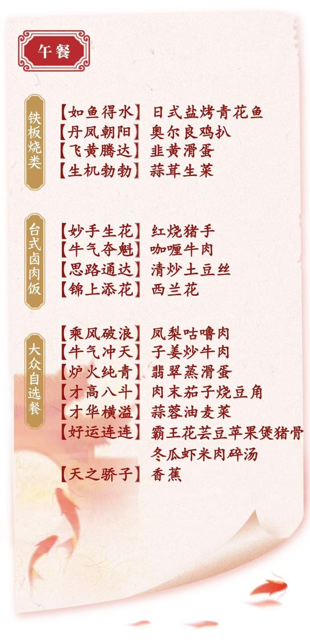 记者看到高考菜单菜式丰富,不少喜闻乐见的菜式有了寓意吉祥的菜名,黄油年糕是金榜题名,水煮蛋是一鸣惊人,鱼腐卤肉是鱼跃龙门,地三鲜是连中三元,招牌麻香鸡是凤舞九天,蒜蓉开边虾是鸿运当头,金奖南乳排骨是荣登金顶。