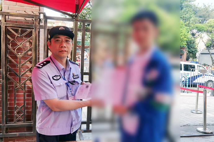 当天上午临近开考前,广州市第七中学考点外,一名考生焦急地向现场民警求助,称赴考途中发现未带身份证。广州越秀公安七中考点安保团队快速核验身份并出具“临时身份证明”,助考生顺利入场。