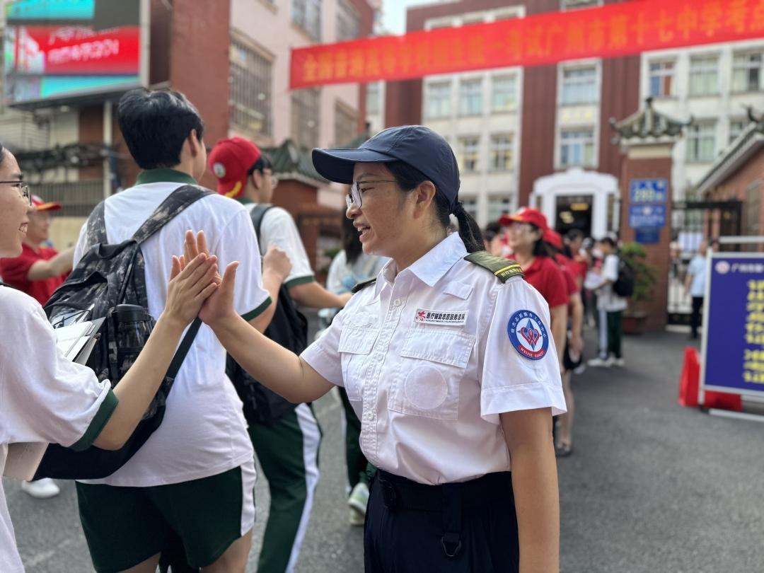 高考期间,团越秀区委每日安排54名应急救援医疗辅助志愿者,自清晨7:30至傍晚18:00,在区内9个考场周边进行不间断巡逻,执行秩序维护、人群疏散及应急事件处理等任务。除专业队伍保驾护航以外,团番禺区委还在广东仲元中学考点外设立文明交通志愿服务点,为考生、家长及工作人员提供雨具、防暑降温用品等便民应急物资,让考生能在安全有序的环境中安心应考。广州市从化区青年志愿者协会联动邻近考点的志愿驿站,全面开展助考服务、文明交通引导及应急救援工作,为高考学子加油鼓劲,细致做好考场周边交通指引,为有需要的考生和家长提供贴心帮助。